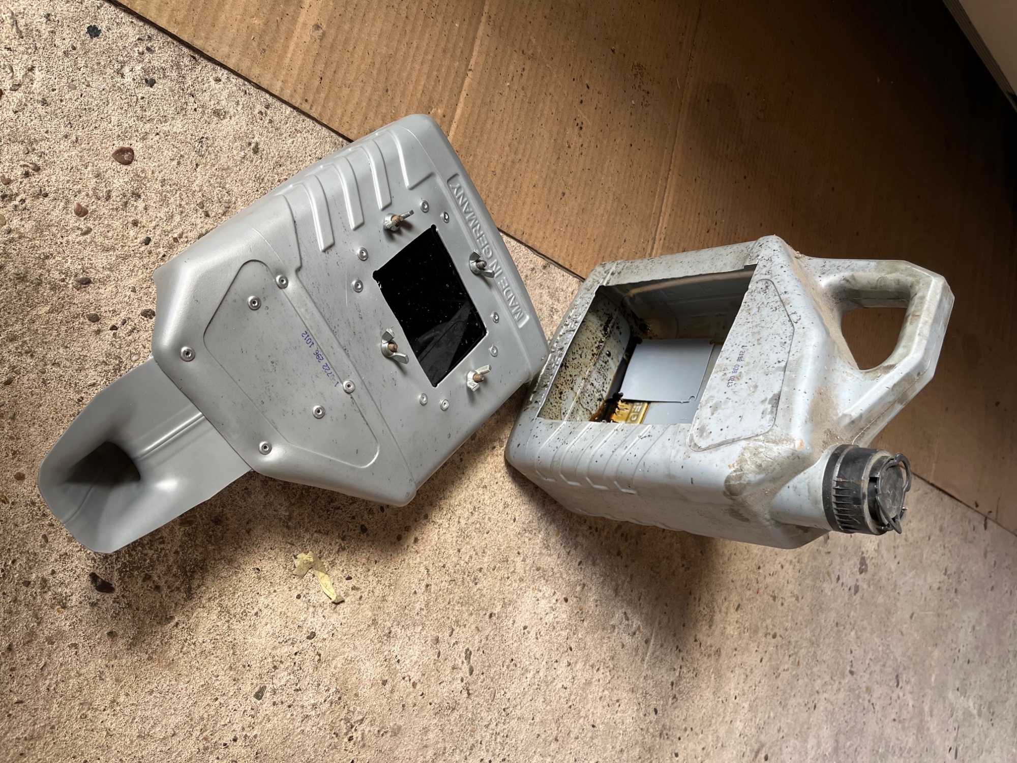 Also habe ich kurzerhand MacGyver gespielt und mithilfe von Cutter, Schere und Popnietzange einen leeren Ölkanister umfunktioniert: