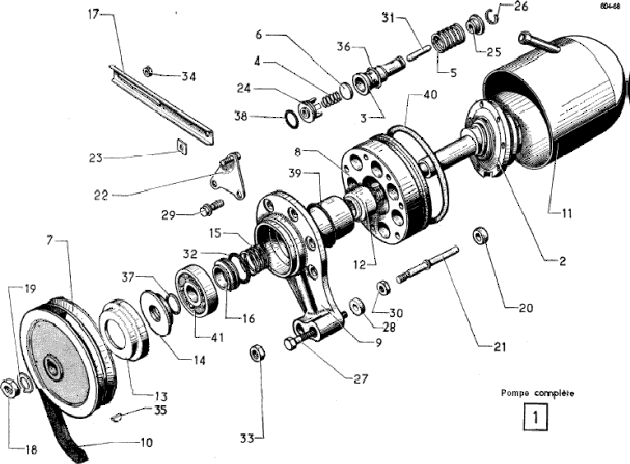 Pumpe ausbauen und ab auf die Werkbank. Schraubensicherung (19) vor dem Schwungrad vorsichtig mit Schraubendreher lösen. Mutter vor dem Schwungrad (18) lösen. Hierzu sollte das Schwungrad (7) mit einem Abzieher gekontert werden. Anschließend Schwundrad abziehen. Vorsicht das die Nut (35) nicht verloren geht. Staubkappe (13) vorsichtig lösen. Aber vorsicht dies ist ein dünnes Blech. Am Besten ein Tapeziermesser längs ansetzen. Anschließend Abedeckung 14 und Dichtung 37 abnehmen.