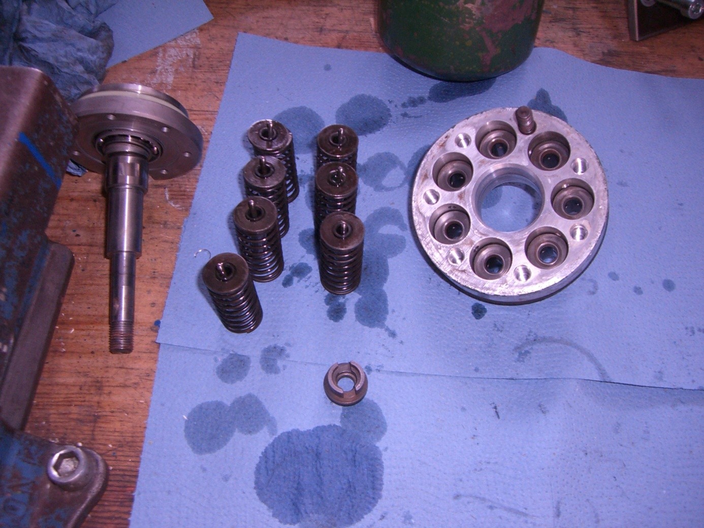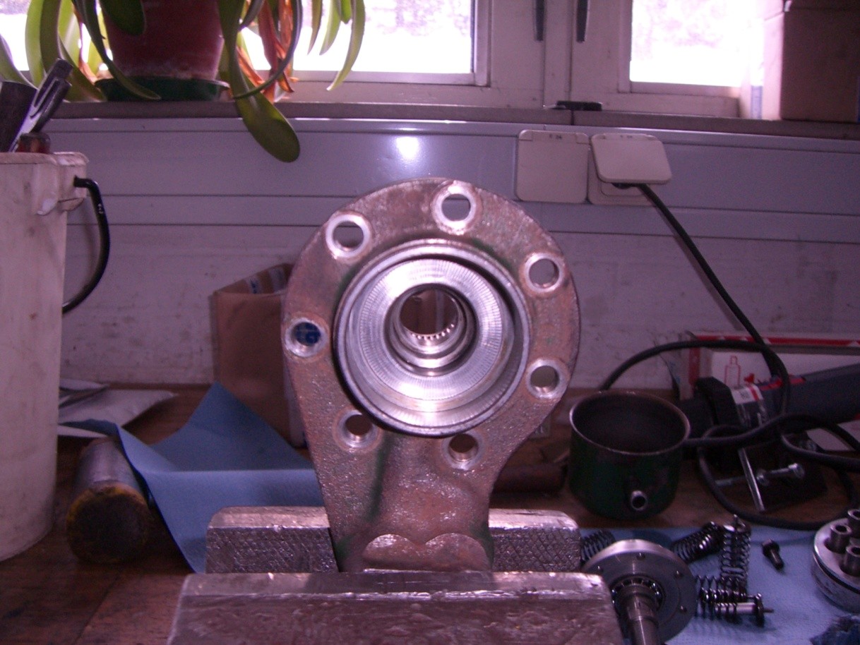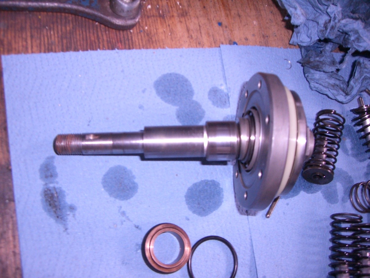 Alle Schrauben ringsum das Pumpengehäuse lösen. Abzieher ansetzen und Pumpengehäuse (11) lösen. Welle (2) aus dem Gehäuse drücken. Dann sieht es so aus Abbildung 3 und Abbildung 4. Vorsicht die sieben Federn springen leicht weg (Abbildung 5). Kugellager 41 vorsichtig rausdrücken.