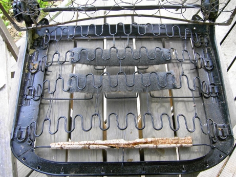 Die Gurte sind an die Wellenfedern ( Nosagfedern ) durch Drahtklammern eingehängt. Improvisation geht auch,