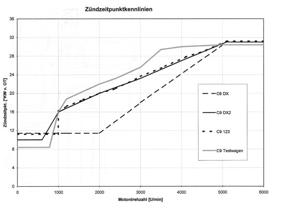 Ich habe einen DX Motor (Modell 68). Ich habe schon früh eine 123 Zündung eingebaut, die damals für den DX Motor mit der C9 Kennline verkauft wurde (nicht einstellbar). Die C9 Kurve erzeugt im unteren Bereich einen wesentlich früheren ZZP als die eigentlich richtige C6. Schadet die C9-Kurve dem DX Motor? Warum hat sich mit dem DX2 die Kurve geändert?
