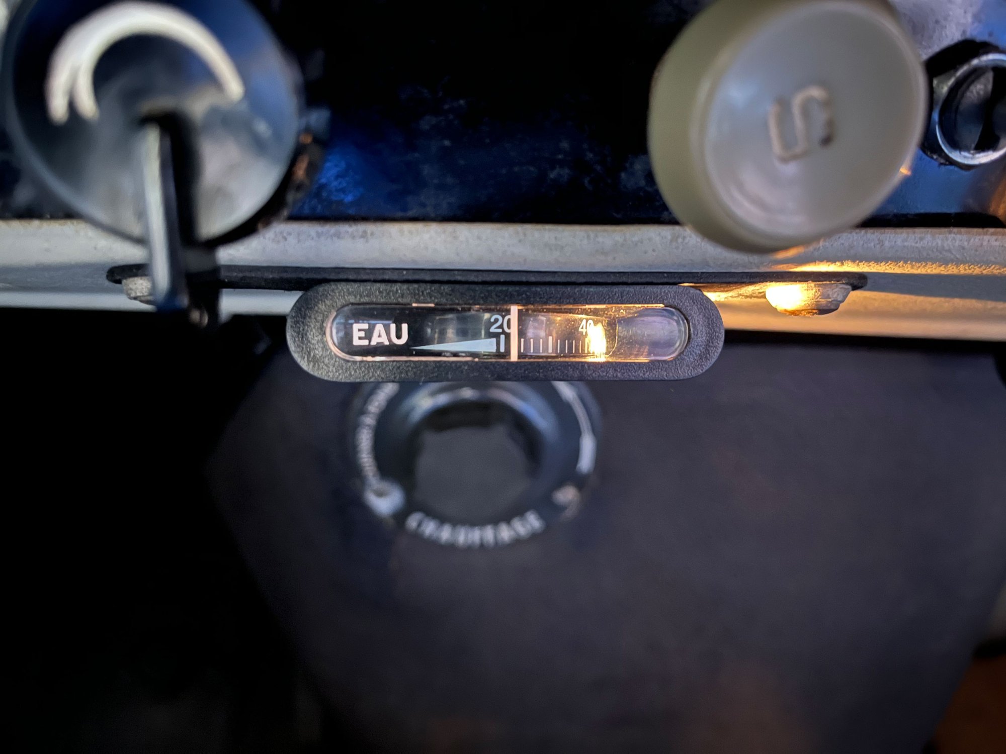 Das Thermometer an sich sitzt an originalen Befestigungspunkten am Unterteil der Instrumententafel auf einem geschwärzten Stück Hartfaserplatte und ist mit einer 1,2W Glassockelleuchte versehen, um auch nachts ablesbar zu sein.Diese Leuchte wird über den Lichtschalter aktiviert.
