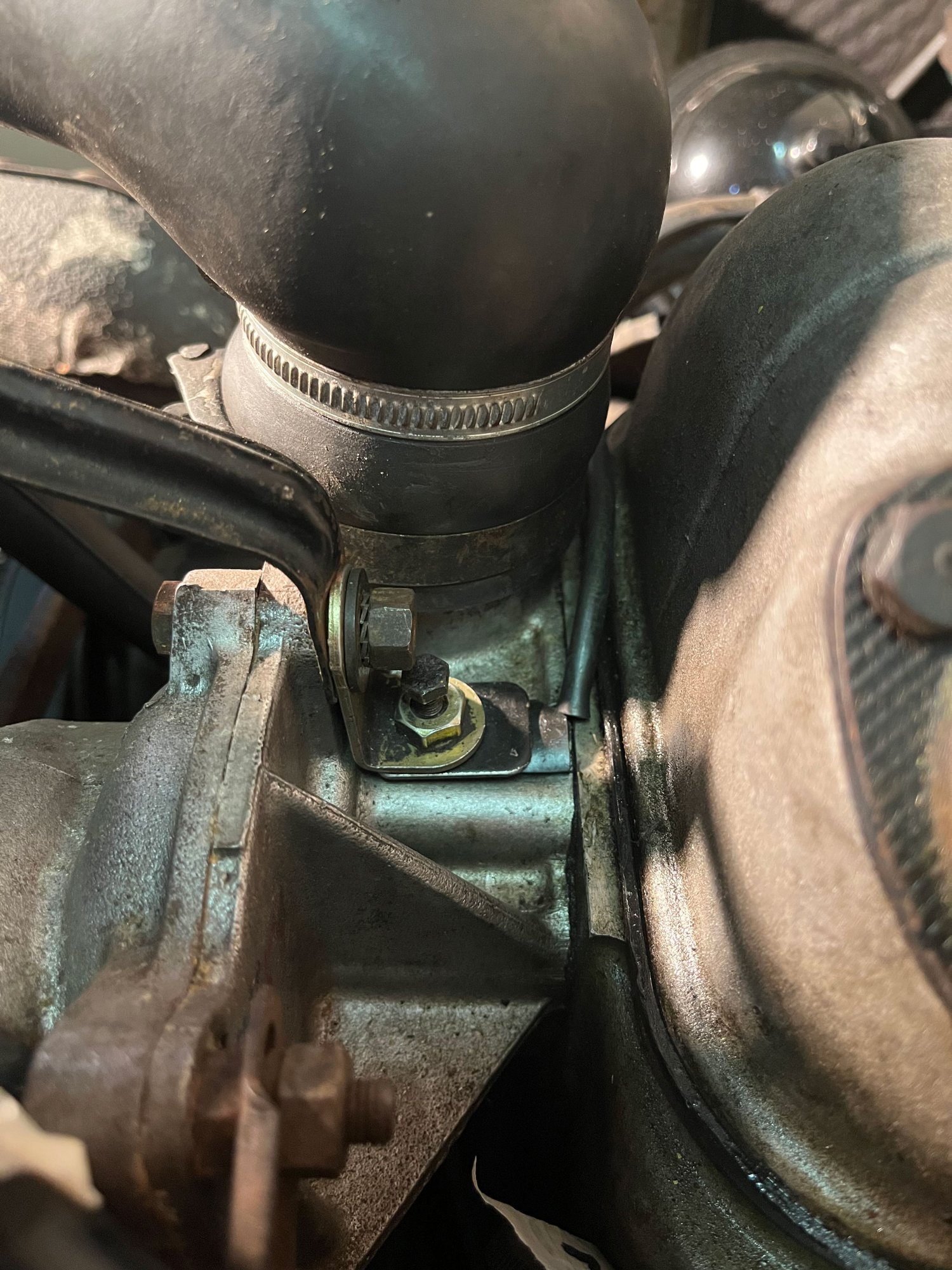 Um Störeinflüsse von der umgebenden Luft zu minimieren, habe ich den Sensor von oben mit einem Stück alten Kühlerschlauchs "isoliert". Gehalten wird das ganze mit einem WInkel aus meinem Bestand, der am Besfestigungspunkt der Haltestrebe für den Kühler befestigt ist. Mittels der vertikal orientierten M5-Schraube wird ein zwischen Winkel und Schlauchstück platziertes Blech so unter Spannung gesetzt, dass der Sensor gut eingefasst ist und direkten Kontakt zum Pumpengehäuse hat.