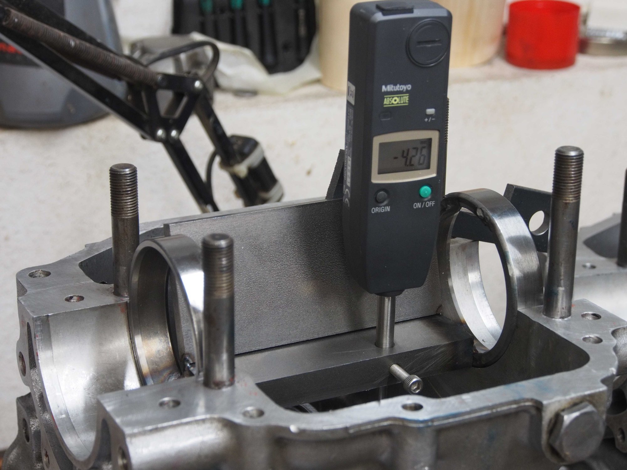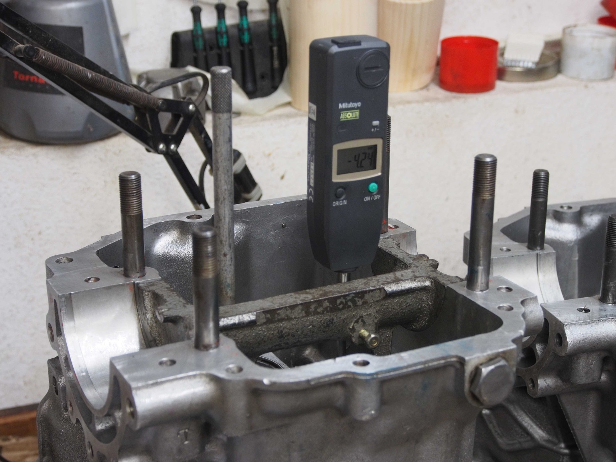 Vorab Kontrolle der Achsenverschiebung in der Höhe. Beide Gehäusehälften zeigen die Verschiebung der Mittelachse nach unten. Gegenprobe der anderen Gehäusehälfte bestätigt die Verschiebung und die Werte. Umständlich da ständig gerechnet werden muss. Nicht genau genug.