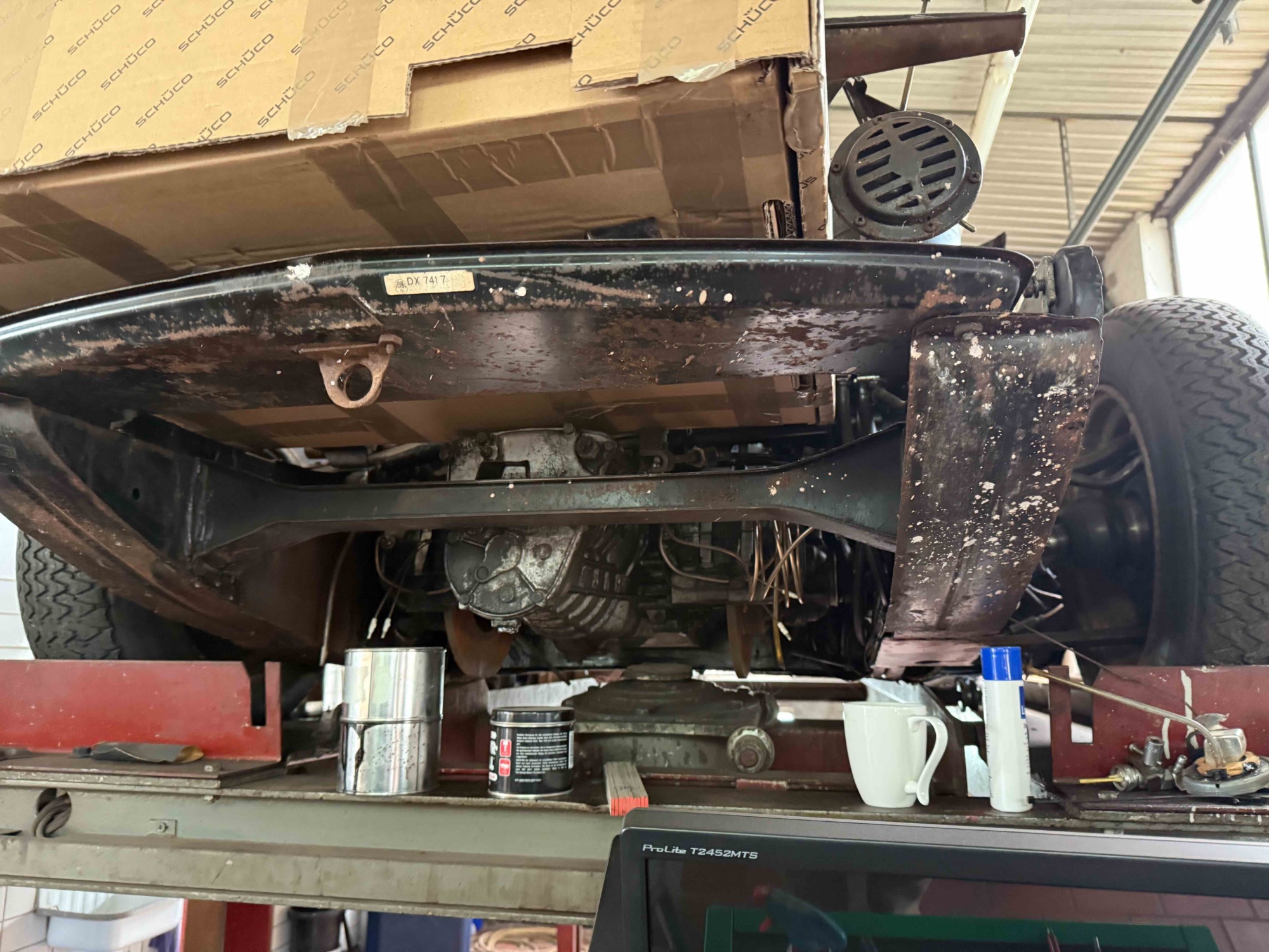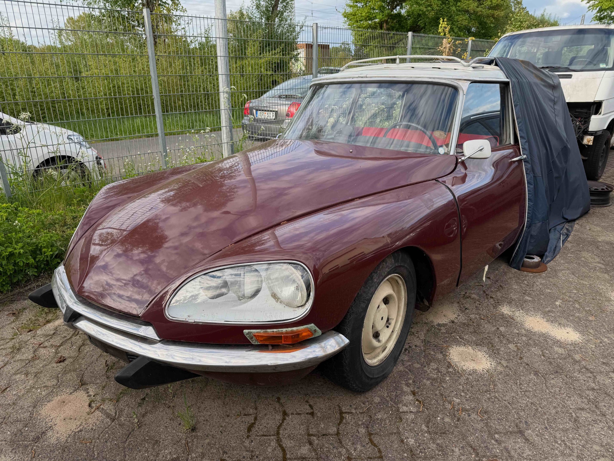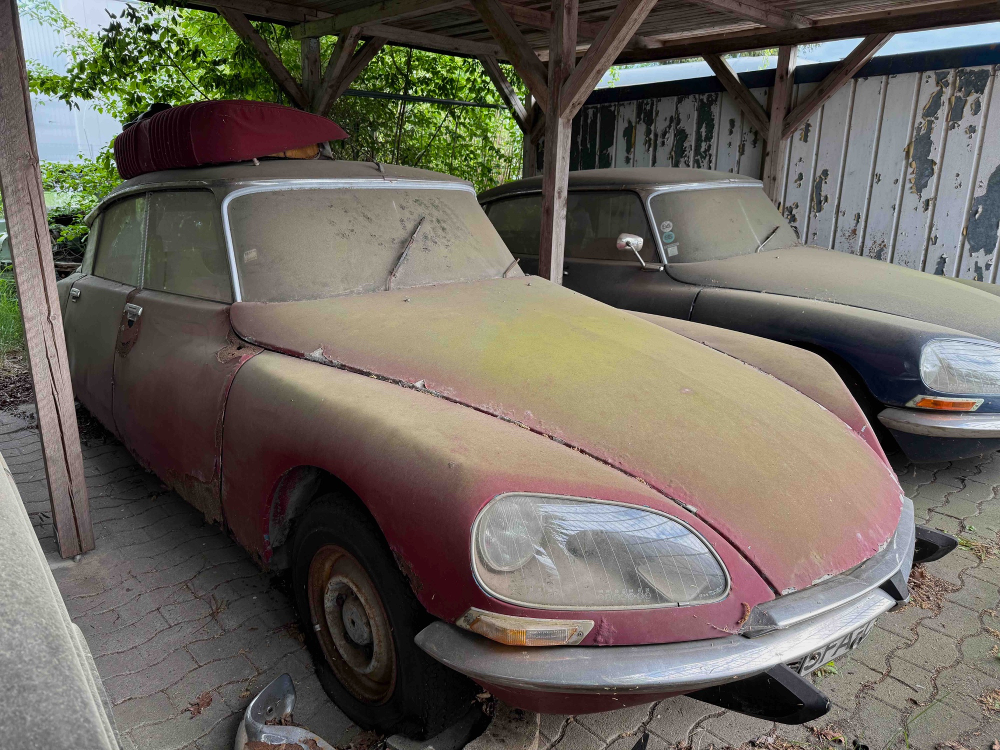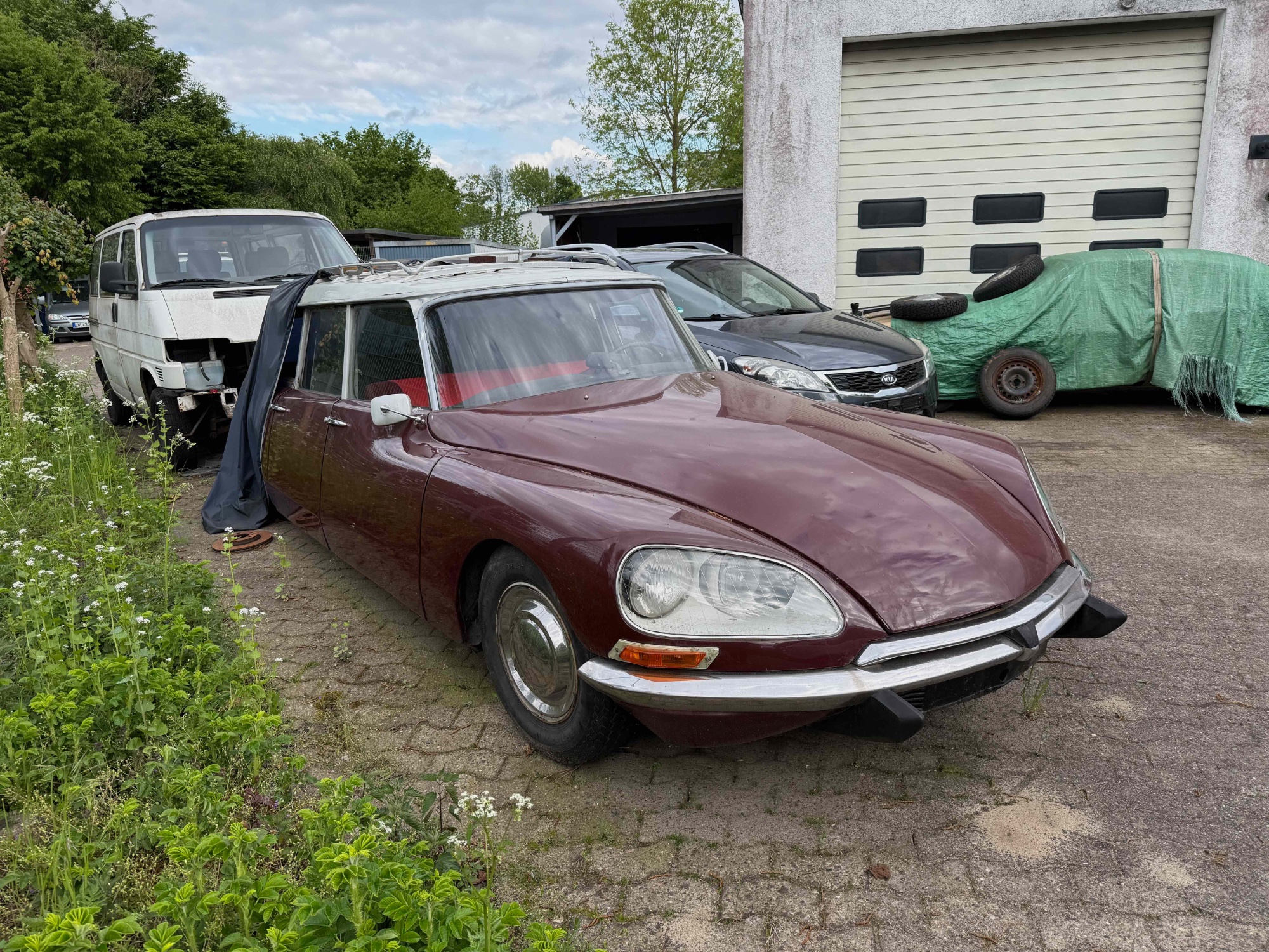 Zum Bestand gehören mehrere Fahrzeuge verschiedener Marken – darunter auch einige interessante D-Modelle. Besonders ins Auge gefallen ist mir eine ID von 1965, die sich aktuell in der Werkstatt auf der Bühne befindet. An dem Wagen wurde bereits gearbeitet: Die ID wurde auf LHM sowie ein 5-Gang-Getriebe umgerüstet – laut Herrn Stritzel ist *alles offiziell eingetragen*. Er war so freundlich, mir die Zulassungspapiere zu zeigen.