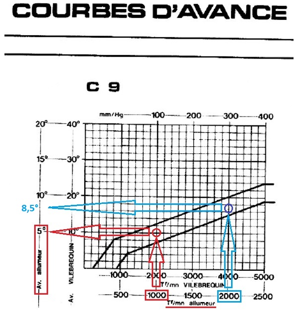 Aus der Grafik C9 lese ich 8,5 Grad Fruehzuendung Kurbelwelle(!) bei 2000 Upm ab. Mit den statischen 12 Grad Kurbelwelle (Schwungscheibenmarkierung der alten Scheiben) kommen dann 20,5 Grad raus, Citroën gibt da 20 Grad an.Claude-Michel hat geschrieben: In den Reparatur- und einstell-Handbüchern sind auf den Grafiken der C9 Kurven: 5° bei 1000 /min abzulesen. Um auf die 10° bei 2000 /min zu kommen wäre der statische ZZp bei 5° zu setzen: 5° + 5° = 10 °.