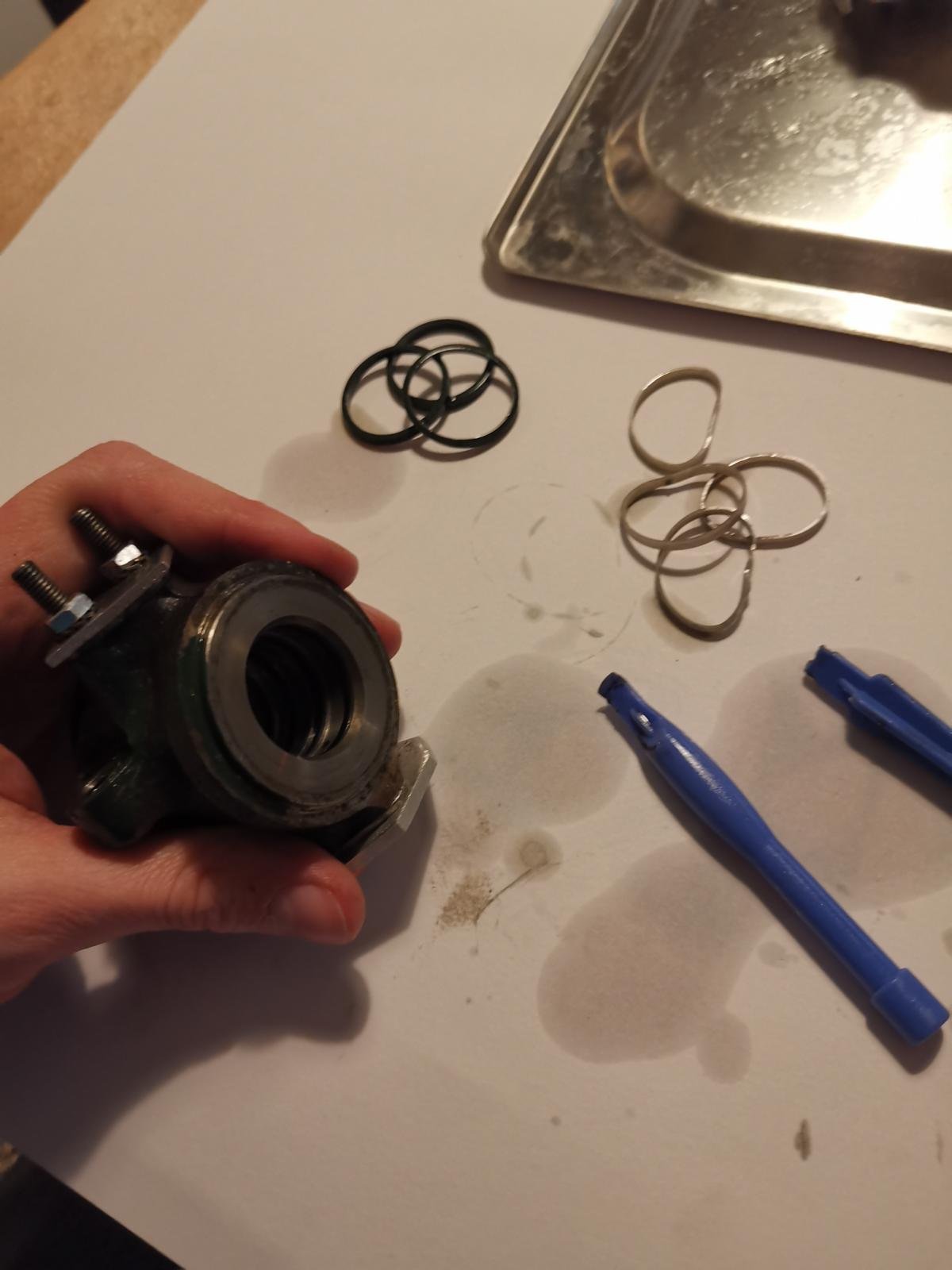 2. Nähnadeln sind ein super Tipp, damit habe ich die Ringe des Zylinders ausgebaut. Beim Lenkkopf fand ich den Winkel dazu etwas zu flach, sodass ich Sorge hatte diesen zu zerkratzen. Da kann vielleicht eine gebogene Nadel helfen, aber mit den Spudgern ging es gut genug.