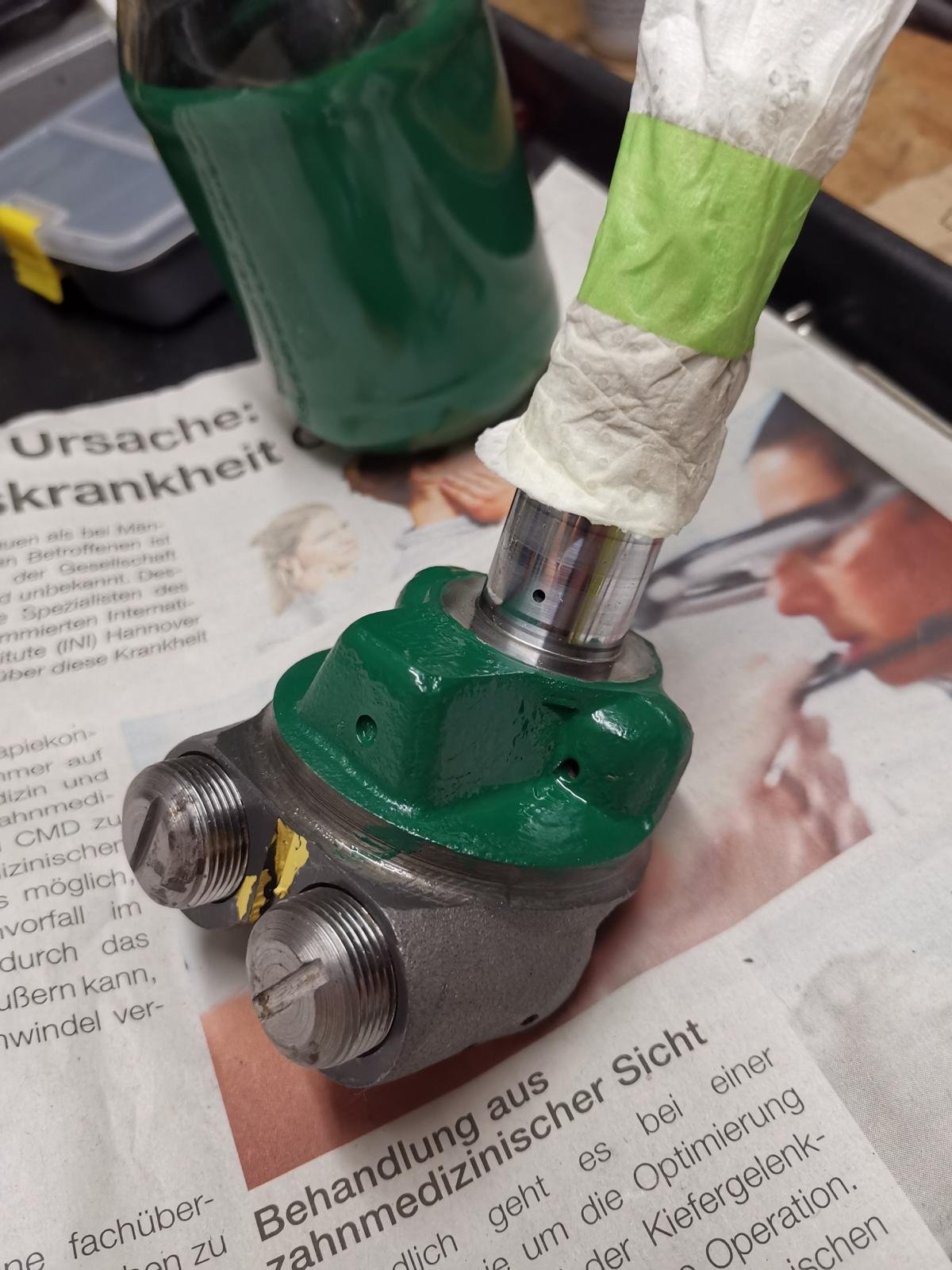 Bild 40: Der Lenkkopf wird abgeklebt und die Anschlüsse verschlossen zum Lackieren und Lagern bis zum Wiedereinbau. Zum genauen Trimmen des Klebebands an scharfen Kanten eignen sich ganz leichte (vorsichtige!) Hammerschläge auf die Kante, während das Teil in der anderen Hand gehalten wrid.