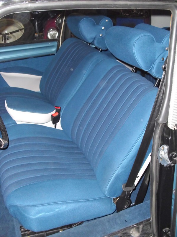 die Sitzbezüge sind nicht glatt, das liegt wirklich an den Fotos. Es ist Stoff. Auch ist die Lackfarbe eigentlich heller (bleu platiné eben). Die Bilder wurden in der Werkstatt ohne Tageslicht gemacht, daher die Farben etwas verfälscht.