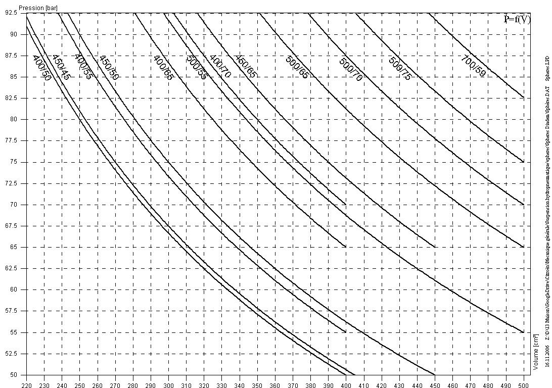 Hier der Druckverlauf in Abhängigkeit vom Volumen für verschiedene Kugeln: