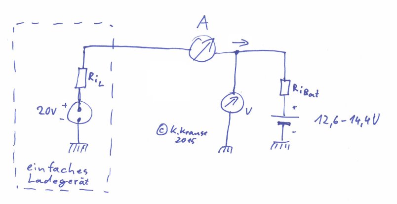 Im Lauf der Ladung steigt die Spannung der Batterie langsam an. Hat die Batterie eine Spannung von 14V erreicht, dann beträgt der Ladestrom (20V-14V)/1,5Ω=4A.
