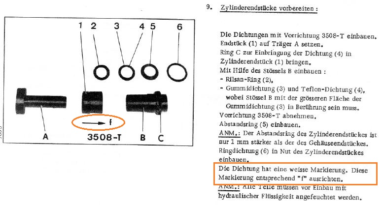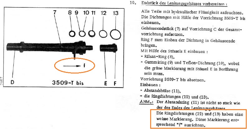 Heute kam ich endlich dazu, anzufangen die Lenkung wieder zusammen zu bauen. Ich habe begonnen die zwei Endstücke vorzubereiten und da ist mir ein Hinweis aus dem Reparaturhandbuch nicht so klar. Die O-Ringe haben eine weiße Farbmarkierung. Diese sollte entsprechend dem Pfeil "f" ausgerichtet werden. Ähm...was heißt das? Wenn ich auf die angehängten Bildern schaue, wäre die weiße Markieung auf der rechten oder auf der linken Seite des O-Rings?