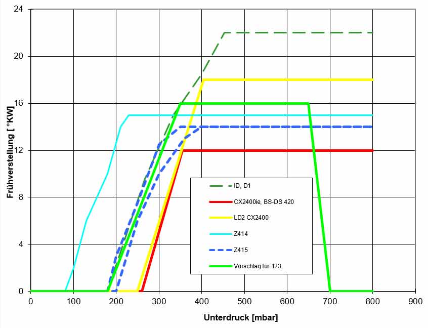 Deine Zündzeitpunktverstellung über die Drehzahl wundert mich etwas: da gibt es keine Drehzahlabhängigkeit von 1800 bis 5700. Komisch, habe sowas noch nicht gesehen.