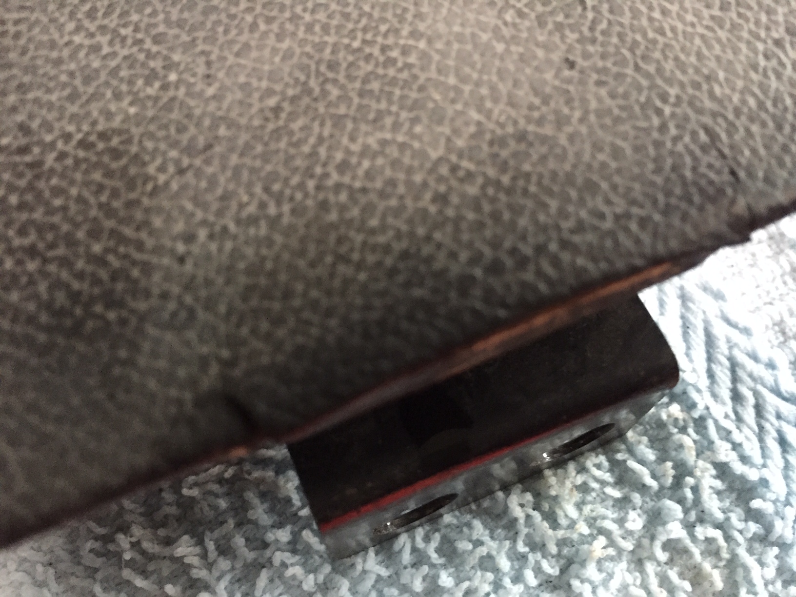 Meist ist nur der verklebte Bezug durch Andruck des geöffneten Deckels an die Scharnierschenkel vom Blech gelöst.