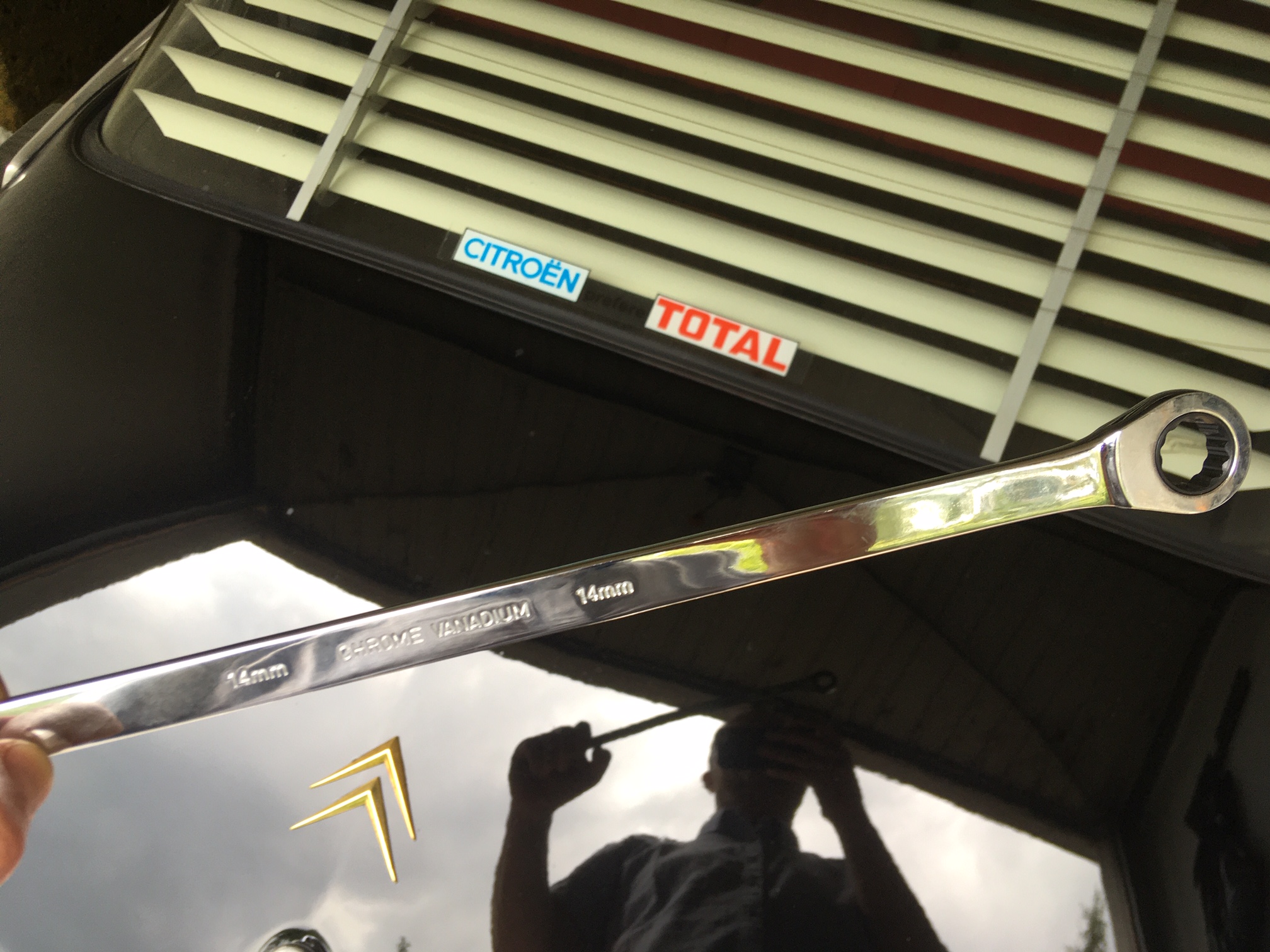 Zur Bestimmung des Schleifpunkts der Kupplung, an dem die eingesteckte Andrehkurbel gerade mirgenommen wird, eigent sich ein extralanger 14er-Ratschenschlüssel hervorragend. Damit kann man endlich feinfühling und vor allem bei laufendem Motor und in sicherer Entfernung der Hände von drehenden Keilriemen und Lüfterpropeller diesen Punkt ermitteln: