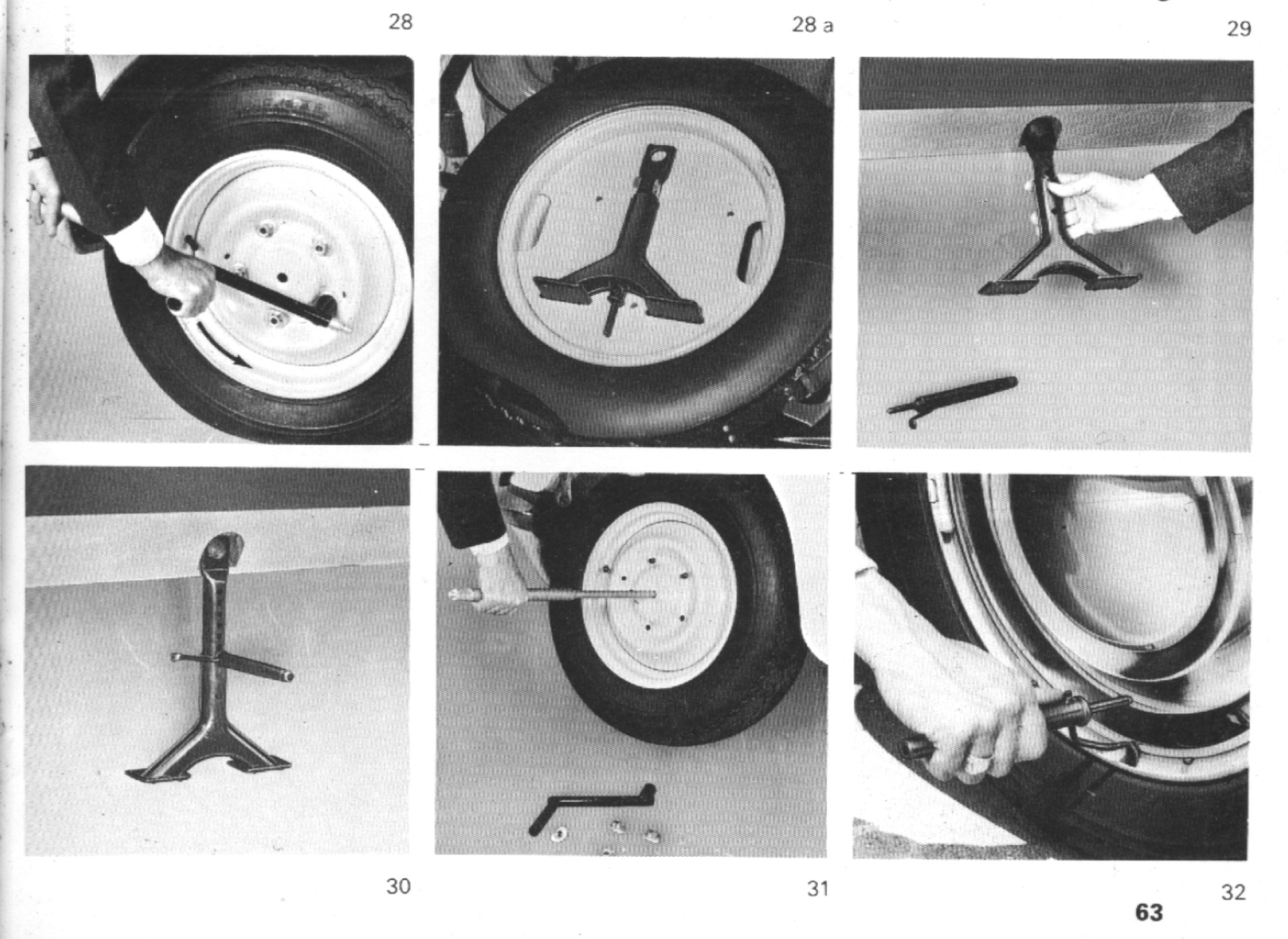 Hier unten einige Bilder (aus zwei englische Bedienungsanleitungen) welche verdeutlichen wie genial multi-funktionell die vier Teile des Radwechselwerkzeuges sind.