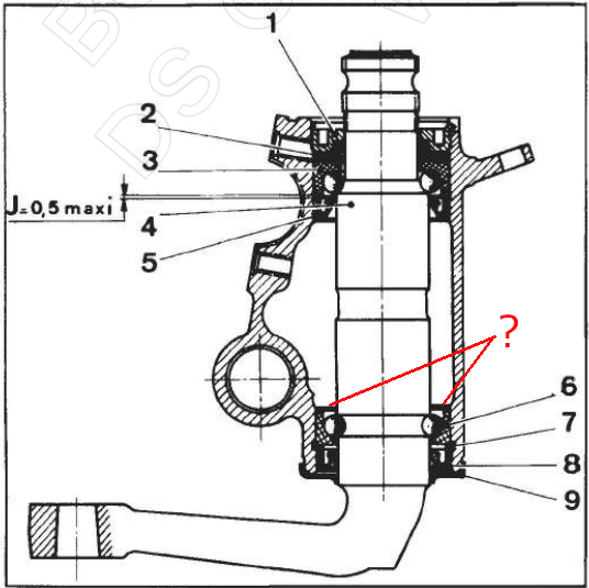 Laut Reparaturhandbuch müsste es über dem unteren Kugellager noch eine Art Dichtung geben, im folgenden Bild mit ? bezeichnet, die dafür sorgt, dass die Kugeln nicht nach oben abhauen können. Oder liegen die Kugeln so tief in der Rinne der Achse, dass sie nicht raus können? Dann wäre aber die Frage wie man das dann wieder sauber montiert, bzw. warum die Kugeln bei mir auf einem Haufen klebten.