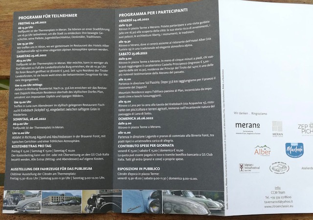 Hallo, vom 24.06.-26.06.2022 finden (unter Vorbehalt Corona) wieder die Citroën Classic Tage in und um Meran/Bozen statt.