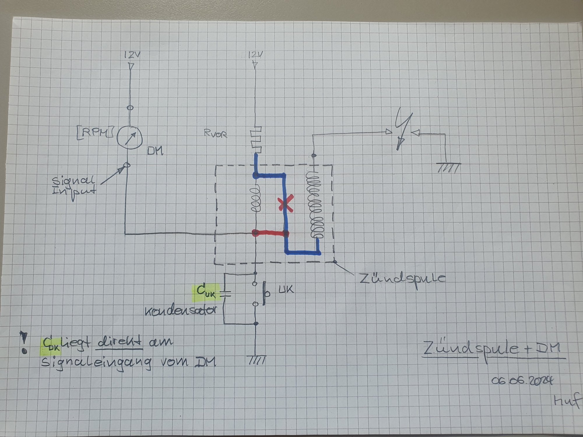 Das bedeutet: Am Signaleingang/Takteingang des Drehzahlmessers liegt direkt ein hochkapazitiver Kondensator (Cuk). Wenn dieses Bauteil defekt, oder zu groß gewählt wurde, werden die Impulse auf der Signalleitung ggf. zu stark gedämpft. Das ist drehzahlabhängig.