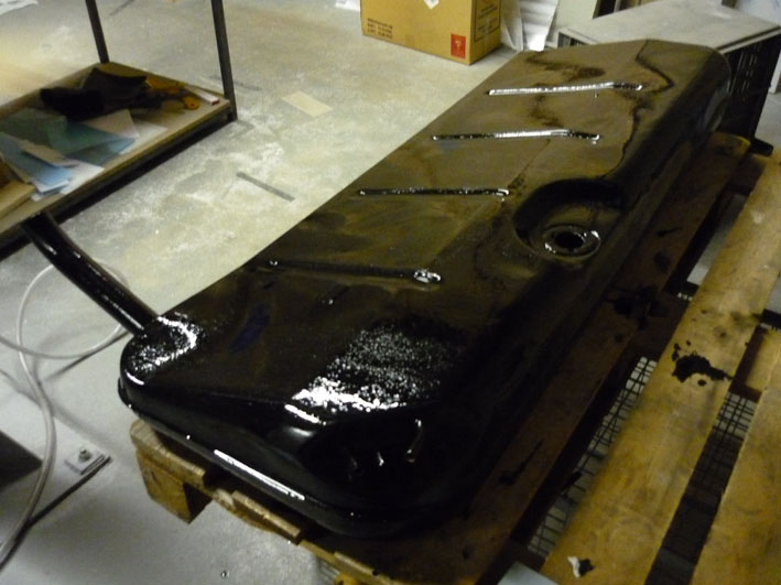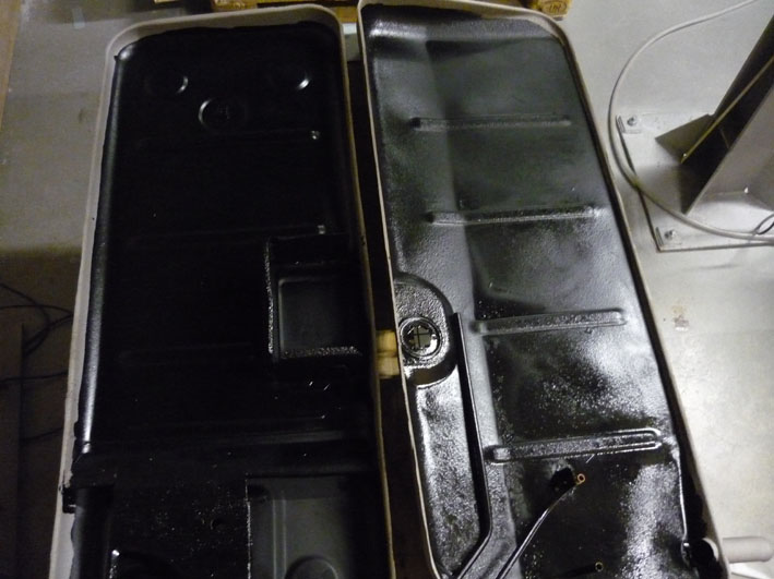 Bild 9 zeigt die Tankhälften innen mit POR 15 satt (!) beschichtet. Die Randbereiche habe ich ca. 2-Fingerbreit freigelassen, um Schweißbeeinträchtigungen und unkontrollierbare Beschädigungen der Beschichtung zu vermeiden.