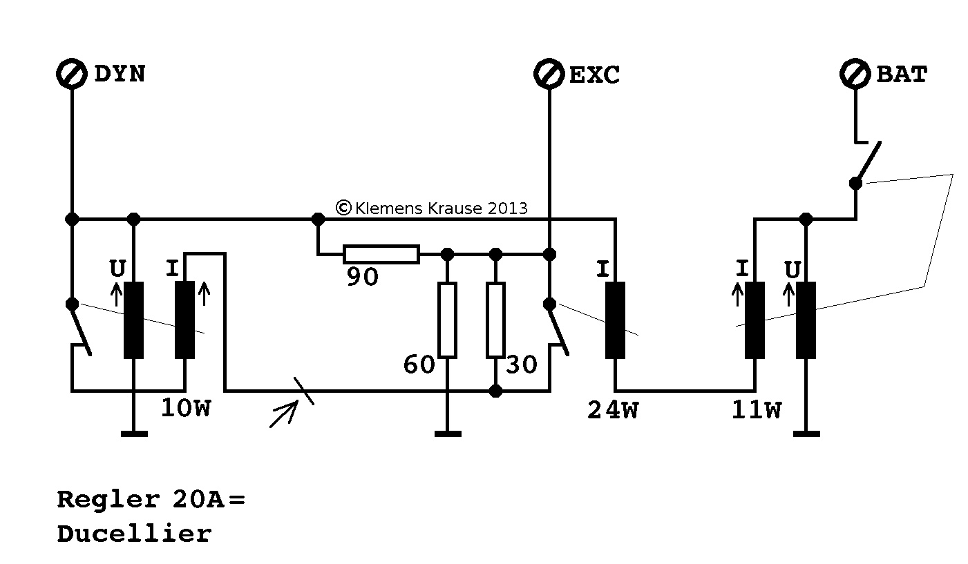 In der Mitte der Feldschwächerkontakt, der den 30-Ohm Widerstand periodisch ein- und ausschaltet und damit den mittleren Ladestrom durch eine Zweipunktregelung "konstant" hält.