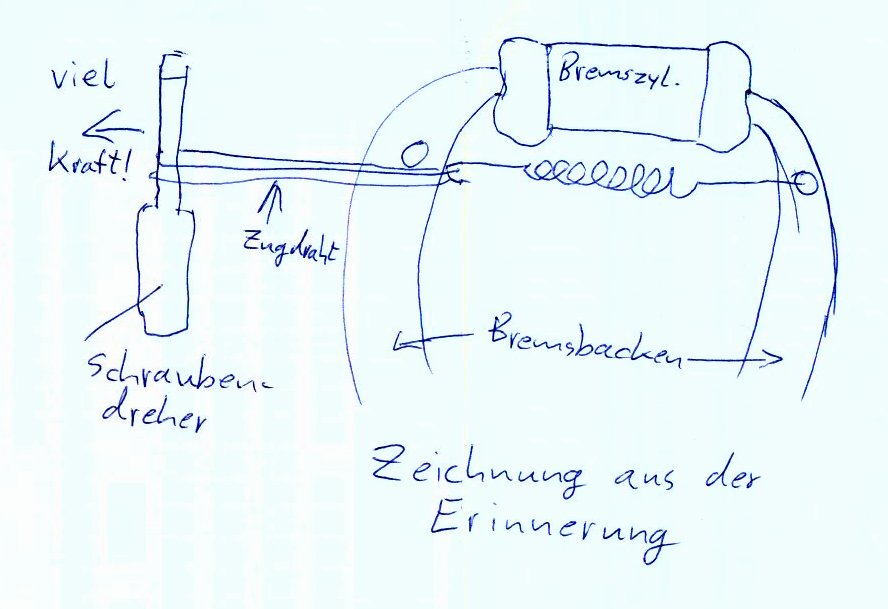 Wir haben sie zunächst in die vordere Bremsbacke eingehängt. Dann haben wir um die hintere Öse der Feder ein paar Windungen Draht geschlungen, die am anderen Ende um einen quer gehaltenen Schraubdreher liefen. Mit diesem quer gehaltenen Schraubendreher als Griff kann man die Feder genügend auseinanderziehen, so dass der zweite Mann sie mit einem stabilen Schraubendreher in das Loch in der hinteren Bremsbacke reindrücken kann.