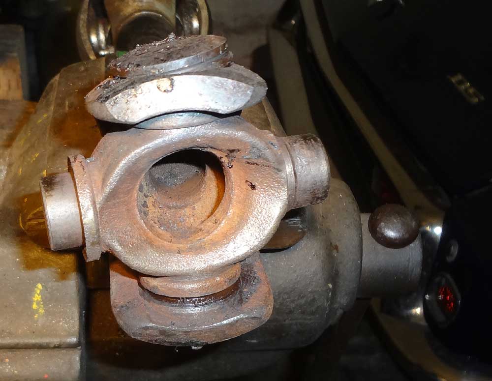 Dann habe ich die gegenüberliegende Büchse auch etwas herausgedrückt. Das Mitnehmerkreutz lässt sich jetzt abnehmen: