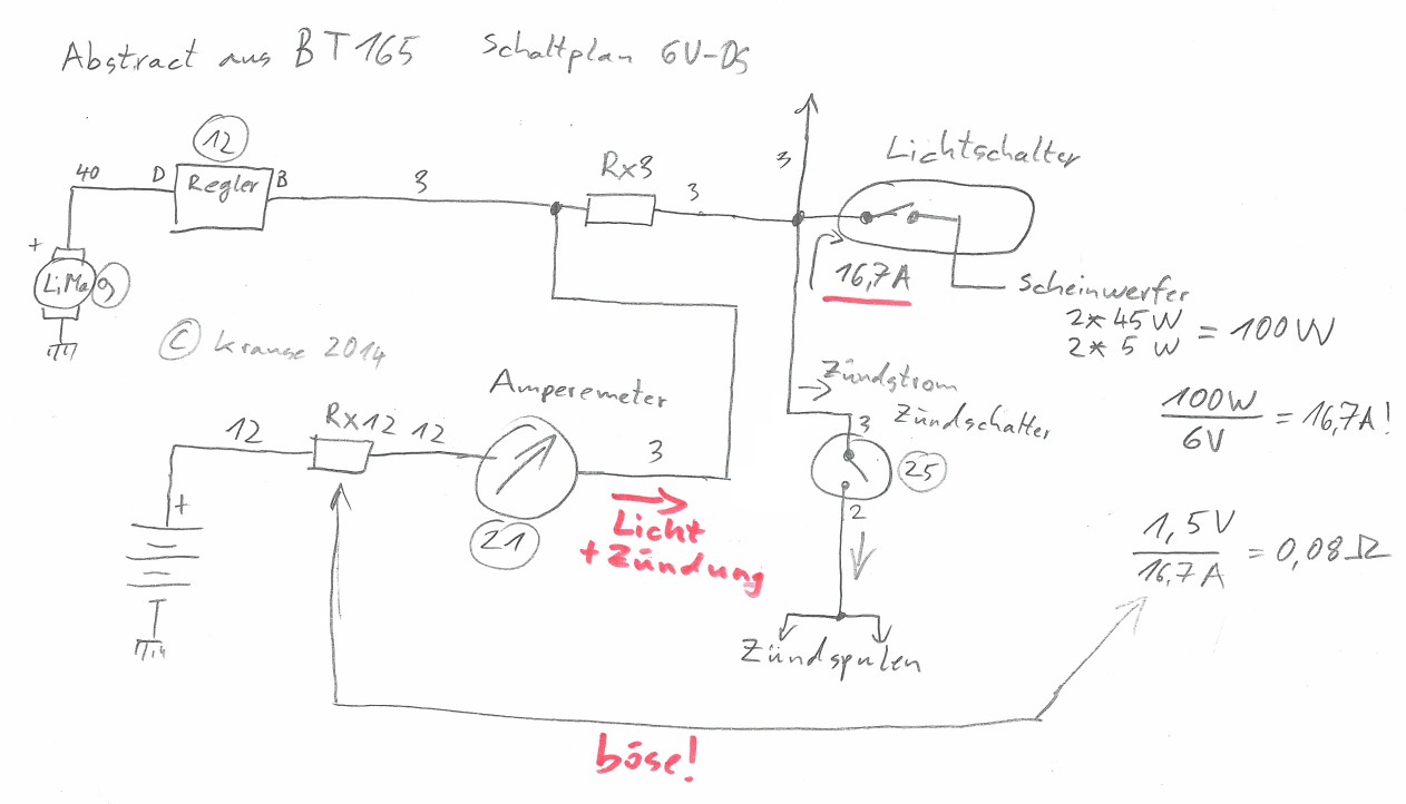 Man sieht zwei relevante Strompfade: Pfad 3 geht vom B-Anschluss der LiMa in die allgemeine Elektrik. Pfad 12 geht vom +Pol der Batterie über das Amperemeter dann ebenfalls nach 3 in die Allgemeinelektrik. In beide Pfade habe ich den Ersatzwiderstand aller Leitungs und Kontaktwiderstände in den beiden Strompfaden eingezeichnet. RX3 und RX12.