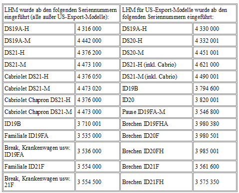 LHS Autos können auf LHM umgerüstet werden, sofern alle Dichtungen durch LHM-geeignete Dichtungen ersetzt werden. Das scheint eine bessere Alternative als die Umstellung auf DOT 5.1 wo man sich ja auch die Arbeit für das erneuern aller Dichtungen machen muß. Es wechselte zwar die Lackfarbe von schwarz auf grün, als Citroën zu LHM wechselte, sonst wurde an den Metallkomponenten selber aber nichts geändert. Hier ist eine Werksübersicht zu Dichtungen Teilenummern für LHS und LHM Fahrzeuge, vom Juni 1969. Es mag verlockend sein, die originale Farbe der Hydraulik-Komponenten beizubehalten, aber aufgrund der Verwechslungesgefahr sollten diese bei Umrüstung auf grüne Flüssigkeit auch grün lackiert werden.