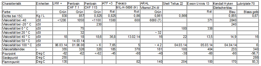 Biostar 32 war am nächsten an der Citroën Spezifikation. Doch sein recht hoher Stockpunkt und niedriger Viskositätsindex waren problematisch, bei Verwendung unter sehr kalten Bedingungen. Biostar ist jetzt nicht mehr verfügbar, aber auch andere Unternehmen bieten ähnliche Produkte, wie z.B. Hydrosafe . Die Vergleichstabelle, unten zeigt jetzt das Hydrosafe Produkt und nicht mehr Biostar. Beachten Sie aber, daß es keine Angabe für den Siedepunkt gibt.