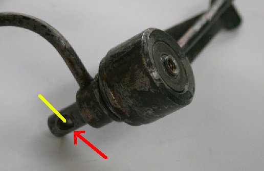Es geht um den Zapfen mit dem roten Pfeil. Der gelbe Strich zeigt die Bohrung für die Sicherungsschraube an, die leicht raus ging.