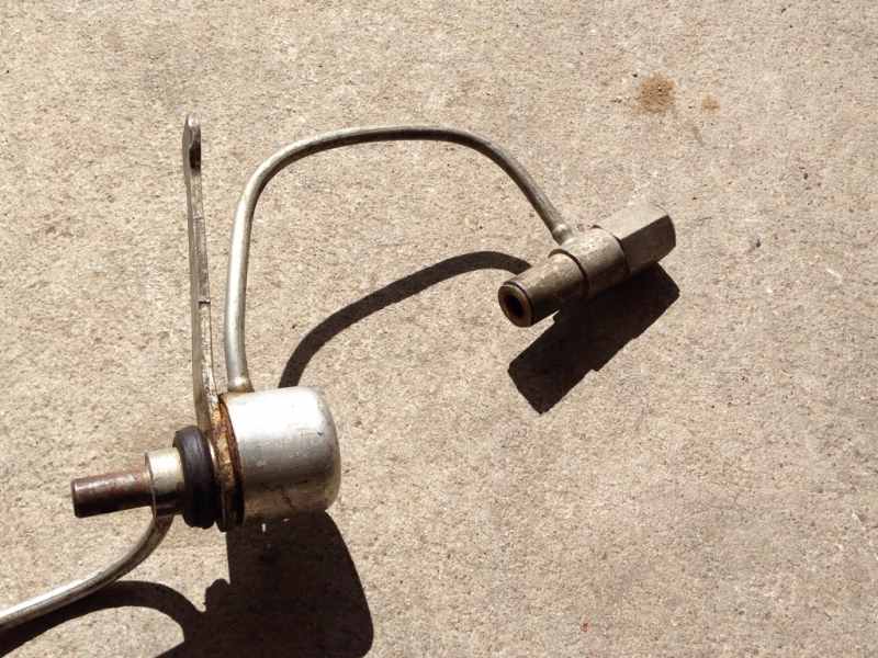 Der Hebel hat ja eine spezielle Funktion: Der Teil der Gelenkleitung, der mit dem Stift in der Drehachse des Schwingarms steckt, dreht sich zusammen mit der Drehbewegung des Schwingarmes relativ zum Chassis, bzw zum anderen Teil der Gelenkleitung. Damit das Mitdrehen des anderen Teils des Gelenkes nicht nur durch die zum T-Stück führende Bremsleitung verhindert wird, ist der Hebel da, der die Drehung des Gelenkkopfes verhindert. Sonst würde die Bremsleitung zum Chassis hin permanent auf Biegung beansprucht werden.