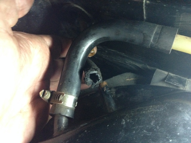 Der Verzweiflung nahe kam dann doch die Erleuchtung: wenn saugseitig Luft in die Benzinleitung kommt, wie hier an der rissigen Tankanschlussleitung geschehen, dann saugt die Pumpe entsprechend Luft bzw. weniger Benzin an. Geringe Undichtigkeiten können einen fast bekloppt machen.