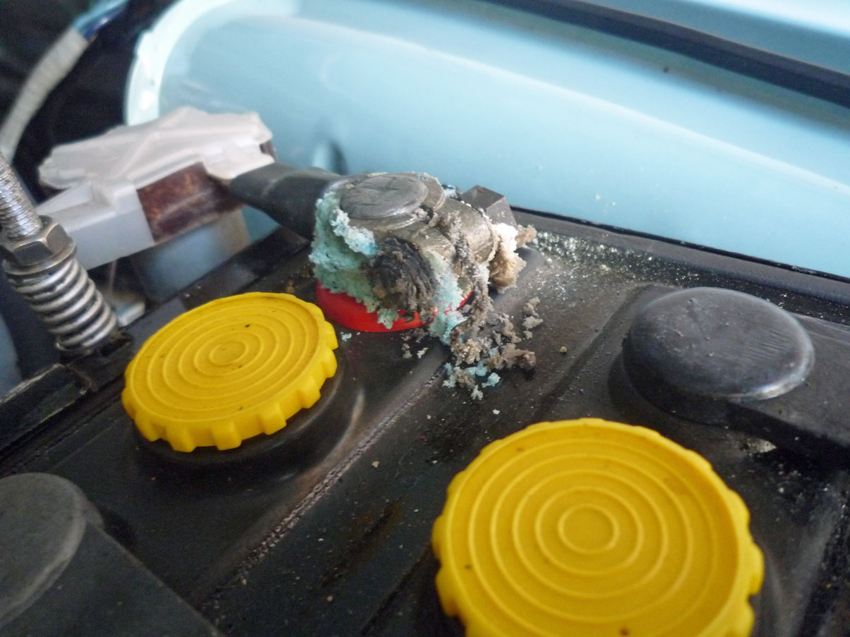 Das hellblaue Salz ist vermutlich Kupfersulfat. Es ist entstanden, da die Kupfereanteile der Befestigung (Bronze?) mit der Schwefelsäure der Batterie reagieren.