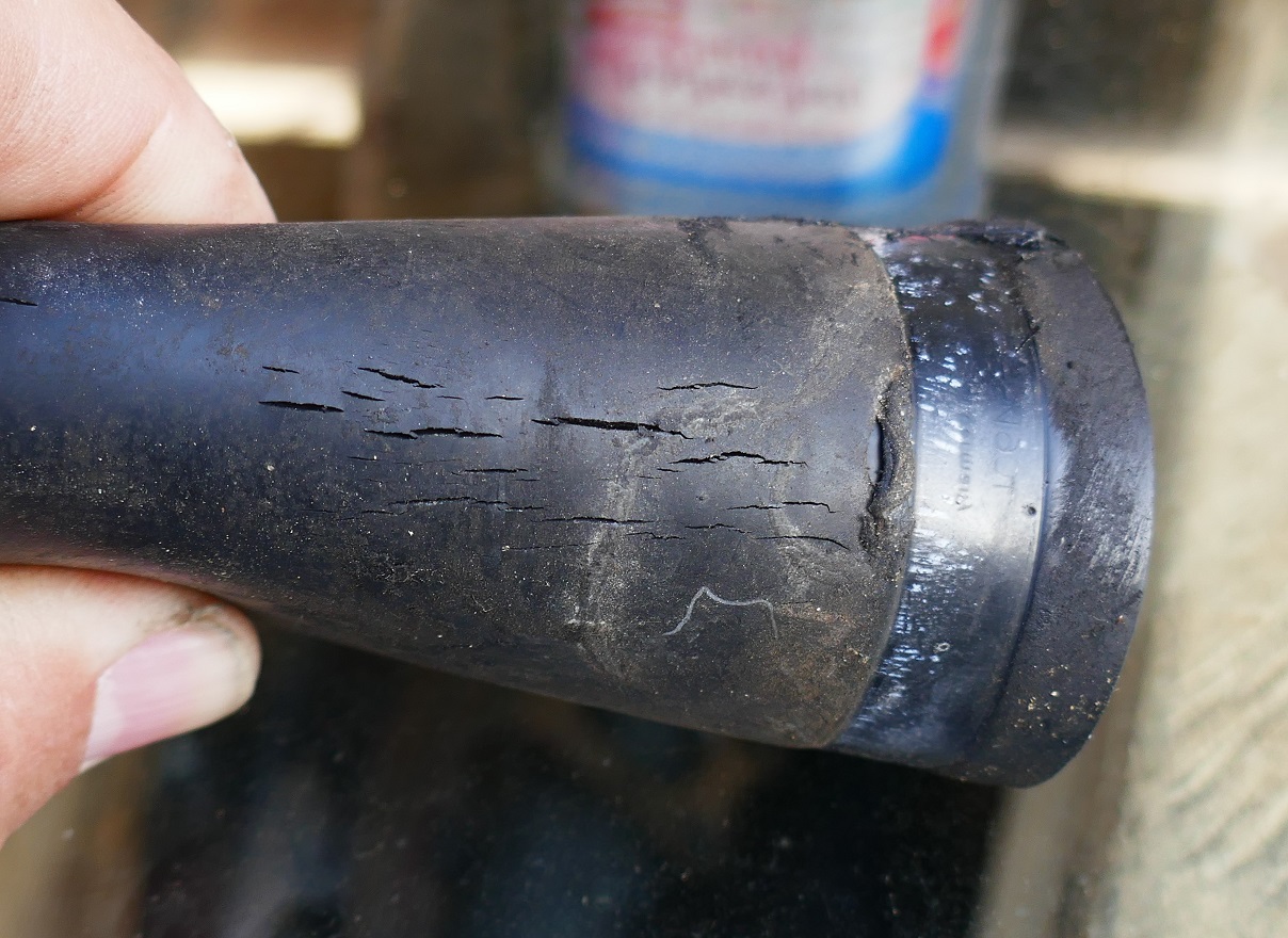 Ich sehe an der Seitenwand hinter dem Schlauch sowas wie Hohlraum- oder Steinschlagwachs. Sowas mögen diese Nachbau-gummis überhaupt nicht weil die durch dessen Ausgasungen angegriffen und spröde werden. Fluid- film ist z.B. bekannt dafür dass es Gummis zersetzt. Fette wie M.Sanders sind da empfehlenswerter.
