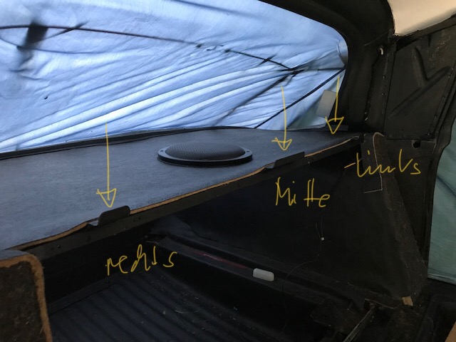 Es gibt ja an der Hutablage drei Blechlaschen - die in der Mitte wird mit der Mimik der Mittelarmlehne verhakt. Rechts und Links davon gibt es ebenfalls zwei Blechlaschen. (siehe Foto)