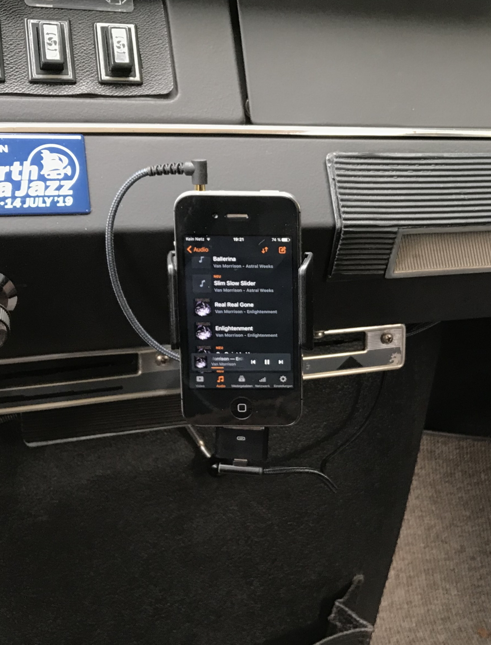 Das nach heutigen Maßstäben sehr zierliche Handy passt zum einen sehr gut in die bestehende Halterung, zum anderen in die Gesamtheit des Citronenarmaturenbrettes.