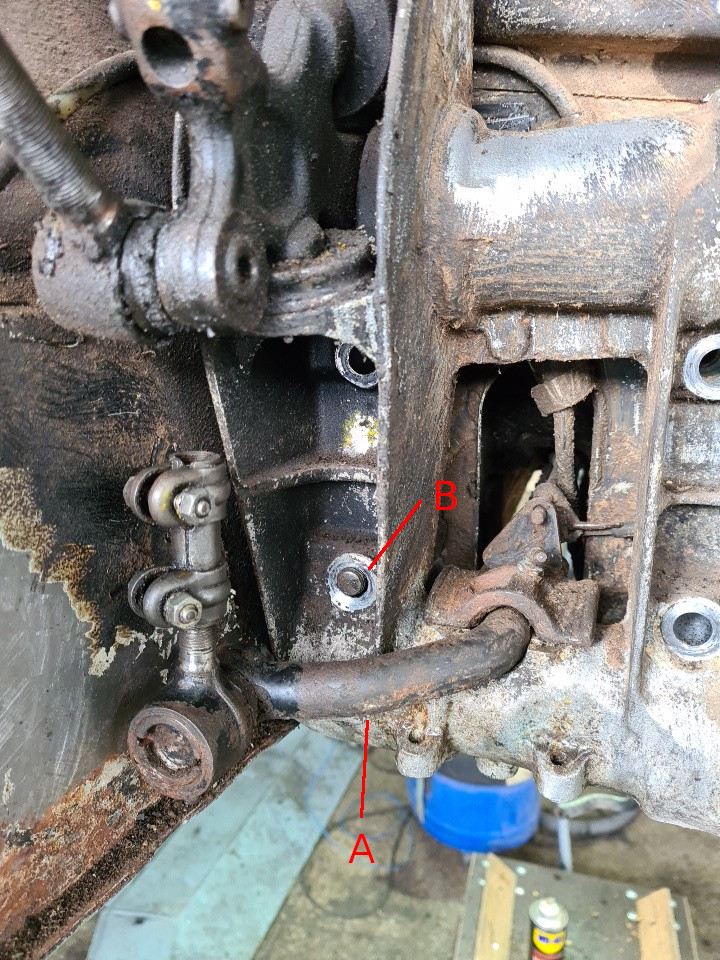 Alle Schrauben und die Mutter des Lagerbocks sind raus. Leider bekomme ich den Lagerbock nicht über den Bolzen B rausgezogen, weil der Stabilisator A dabei im Weg ist. Muss der Stabilisator auch raus oder geht das ohne Ausbauen des Stabilisators? Der Bolzen hat von der Motorraumseite keinen Sechskant sondern nur einen Rundkopf, so dass ich ihn nicht dort rausschrauben kann.