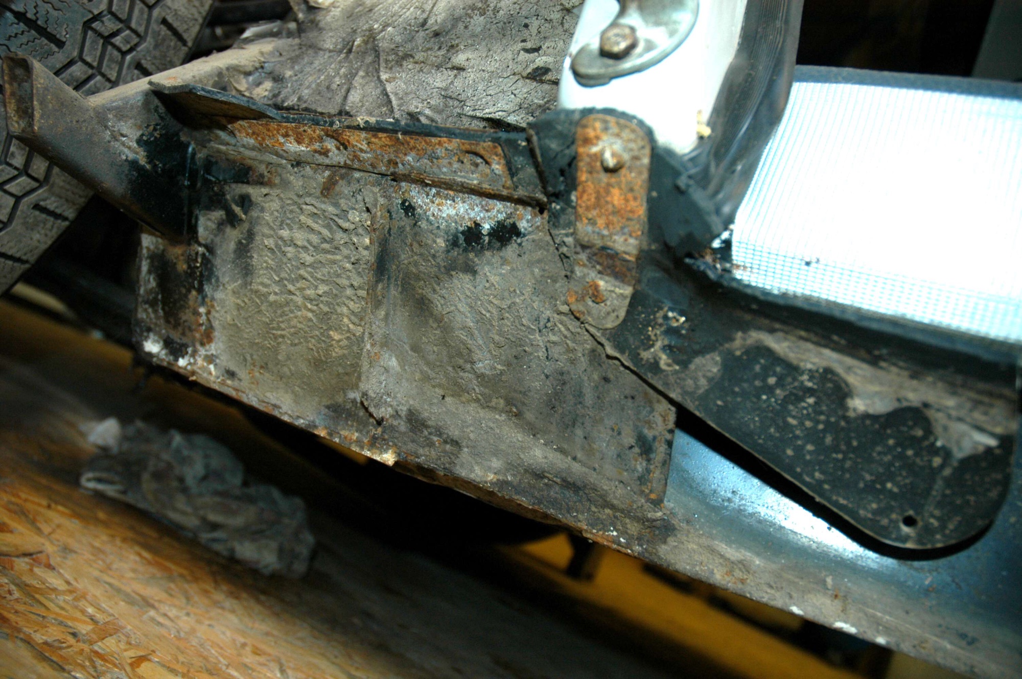 Die letzte Schraube ist gleichzeitig die Erste die das Verschlußblech des Aussenschwellers hält. Das Gummi ist von oben an dem langen Winkel vernietet.