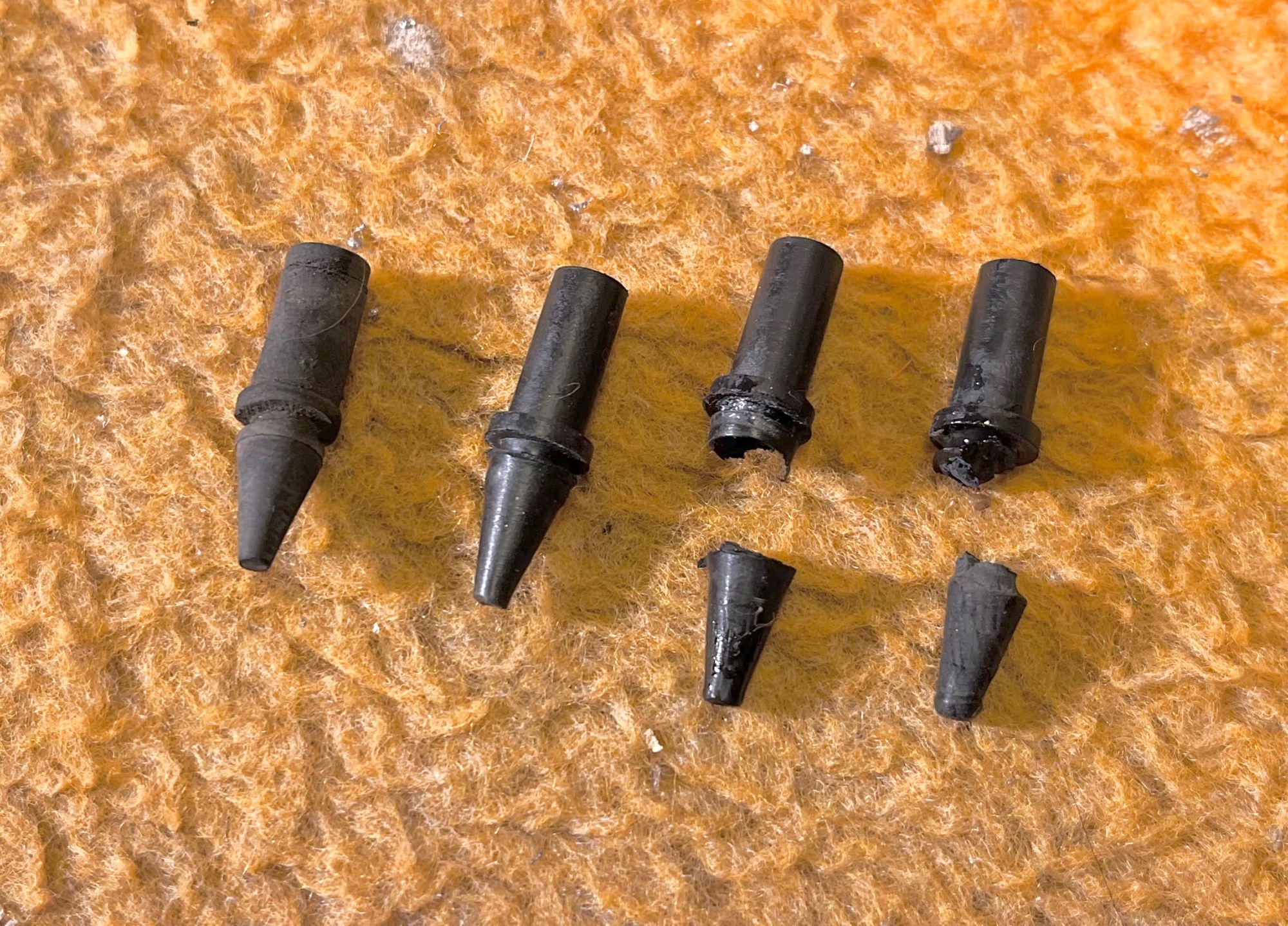 Auf dem Foto sieht man links ein Originalgummi, rechts daneben den neuen Nachbau. Die zwei rechten Gummis wurden beim Einbauversuch zerstört. Der Tipp von Konrad, besser ein paar mehr Gummis zu bestellen, ist also zutreffend.