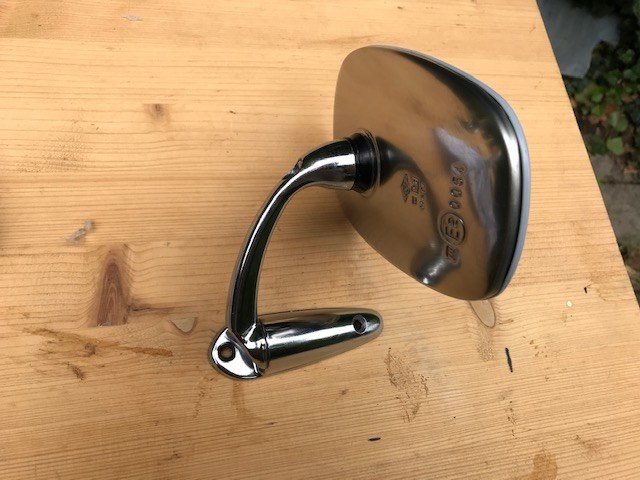 Diese Spiegel habe ich darum mitte Ende der 80er in Essen auf der Oldtimermesse in der Gruga gekauft - waren an einem Stand gar nicht teuer. Mir erschienen die beiden kleinen Löcher für die Blechschrauben zudem immer als das kleinste Übel!