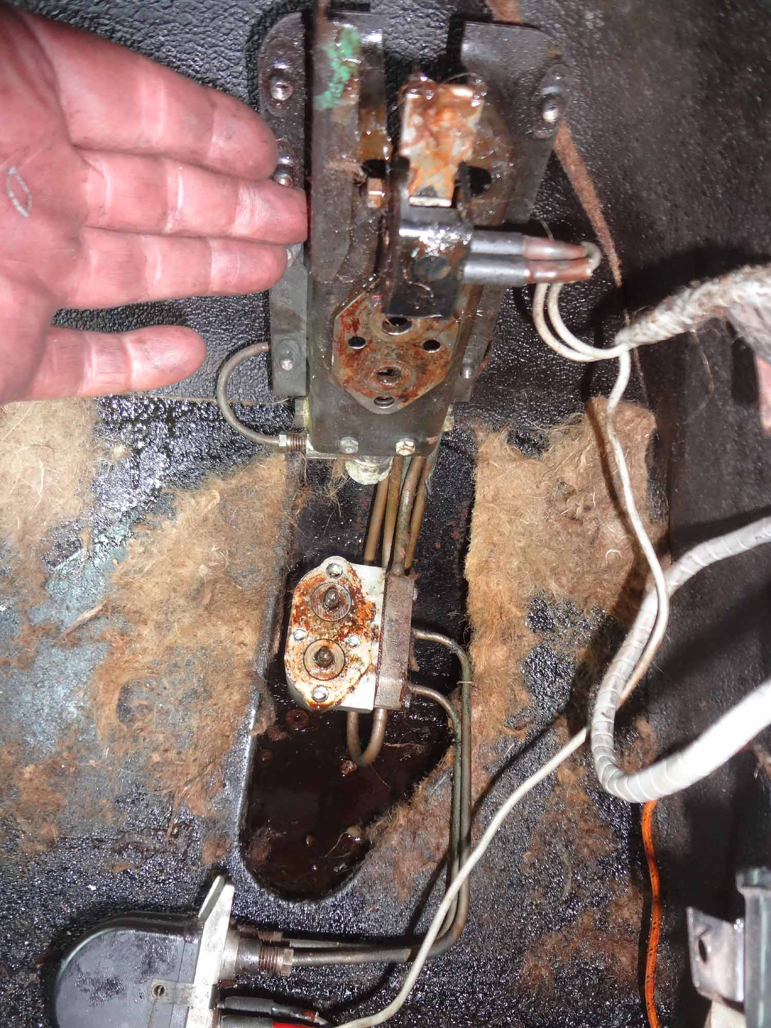 nun habe ich das Bremsventil wieder eingebaut und die LHM-Anschlüsse neu abgedichtet. Danach habe ich die Anlage wieder unter Druck gesetzt und das Ventil für zwei Stunden dauerhaft betätigt (siehe Aufbau-Foto, da sieht man auch, wie das LHM die Dämmmatten zerstört), ähnlich wie Pit es im Thread "Erfahrungen Bremsventil" gemacht hat. Nach zwei Stunden sah es wie auf dem Foto aus. Leider habe ich unter dem Auto nur eine Pappe liegen und kein Behälter, um das Lecköl aufzufangen, aber ich glaube, da war nicht viel, wenn überhaupt. Auf dem Bodenblech war auch nichts, vielleicht hat`s ja geholfen. Allerdings ist es am Anschluss des Leckölschlauchs ein wenig feucht, was aber nicht am Schlauch liegt. Eventuell ist die Lötung nicht ganz dicht. Das werde ich nochmal überprüfen.