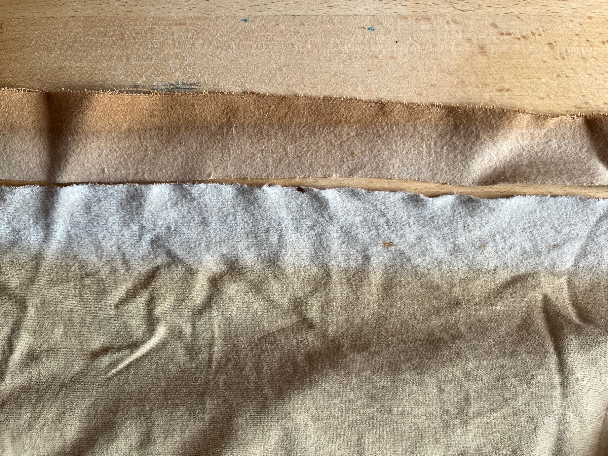 Rückseite (der neuere Stoff ist deutlich dünner und war ursprünglich Schaumstoff-kaschiert, der ältere (originale) ist aus schwererer Qualität und war mutmaßlich bereits im Neuzustand eher beige: