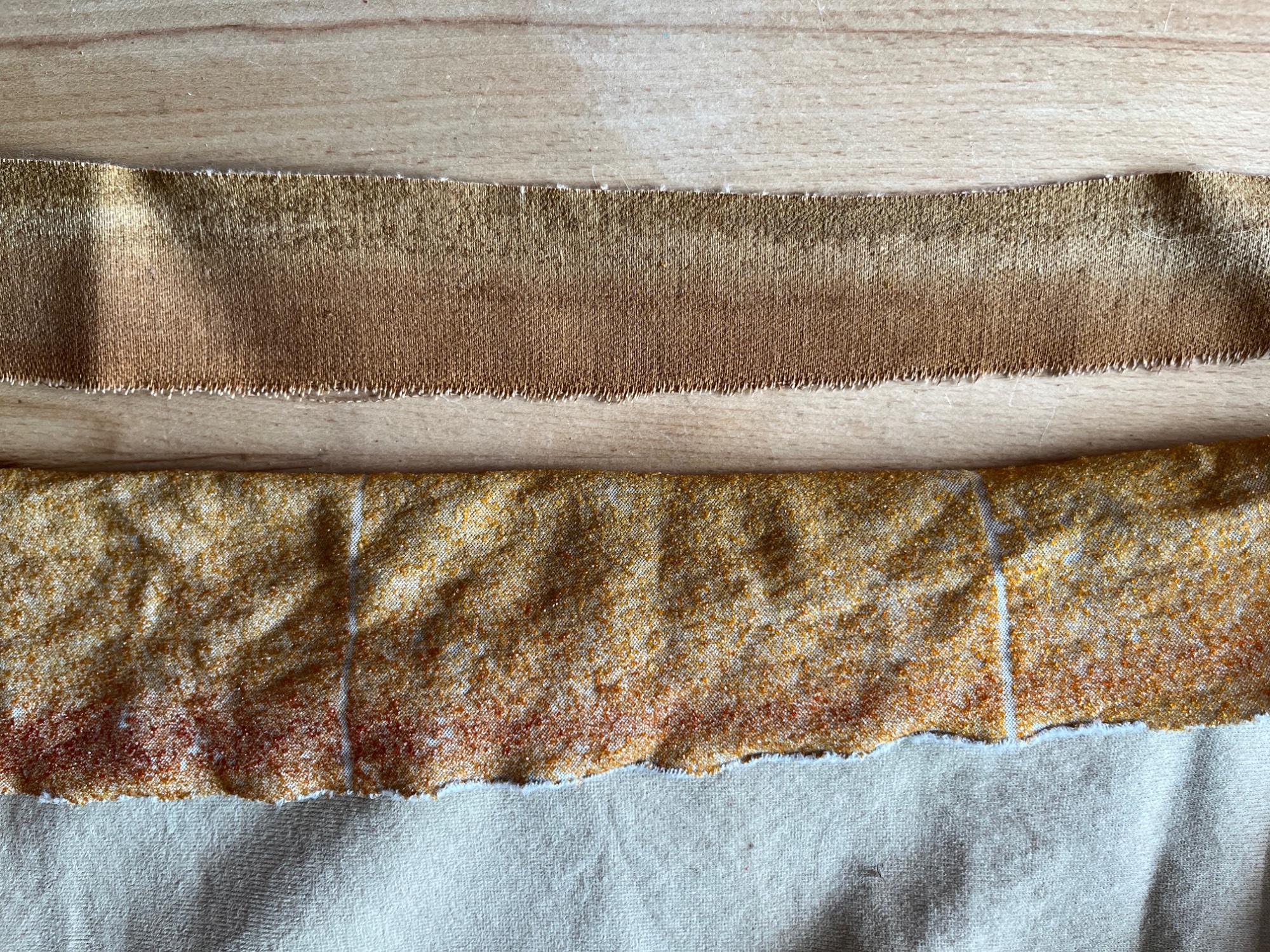 Der Referenz-Streifen stellt ein Stück des relativ dicken Original-Himmels dar, hier im Vergleich zu einem späteren Himmelstoff (beide anteilig vergilbt):