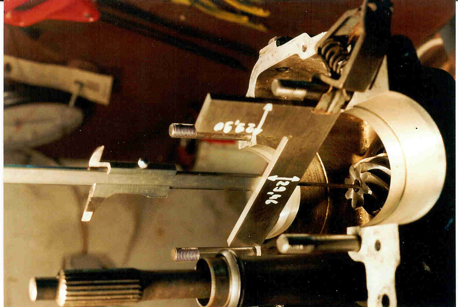 Dabei habe ich erst mit dem Winkel über den beiden Lagerstellen den Abstand der Lagermittelpunkte von der Teilebene gemessen, den Mittelwert gebildet und dann wie auf dem Bild sichtbar die Kegelradtiefe zur Teilebene gemessen. Den oben bestimmten Abstand dazu gerechnet ergibt den Abstand des Kegelrads zur Lagerachse.