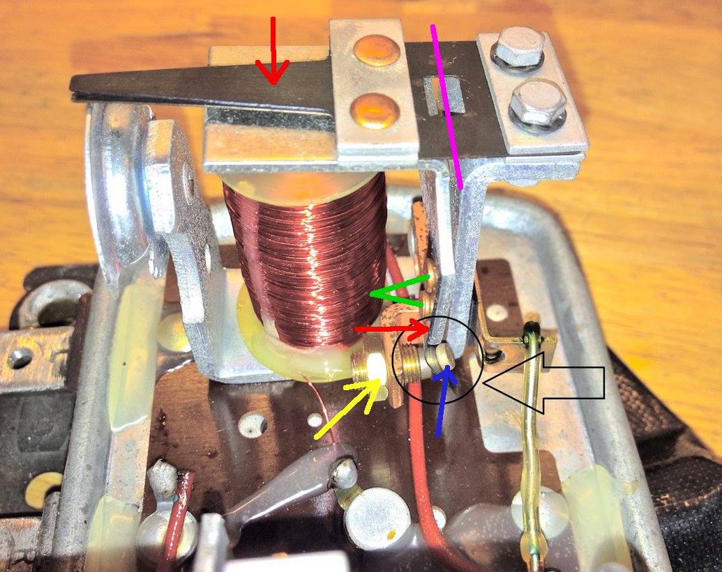 Steigt die Spannung an der Spule, dann wird der Anker an die Spule rangezogen (vertikaler roter Pfeil). Der an der Feder oben angenietete Metallwinkel dreht sich dadurch um die imaginäre violette Achse entgegen dem Uhrzeigersinn. Dadurch entfernt er sich von dem feststehenden Kontakt (gelber Pfeil) in Richtung des horizontalen roten Pfeiles. Wenn ich jetzt davon ausgehe, dass der Klopps auf den mein blauer Pfeil zeigt, nicht der eigentliche Kontakt ist, sondern der Nietkopf
