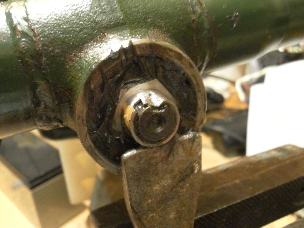 Die Bundmutter am Ende des Ritzels wird durch Verstemmen deren Kragen in eine Kerbe gesichert. Beim Zerlegen, wird der Kragen an dieser Stelle so beschädigt, dass ein zweites Sichern nicht möglich ist. Leider hatte ich keine neue Mutter. Ich habe eine dünne Unterlegscheibe zwischen Mutter und Kugellagerinnenring gelegt. Da der Gewindegang 1,2 mm beträgt, verschiebt sich mit einer 0,2 mm Unterlegscheibe die Position der Mutter um 1/6 Umdrehung.