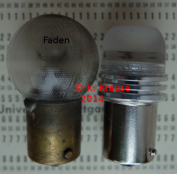 Oben das Bremslicht ohne Abdeckung. Rechts LED, links 21W Glühbirne.