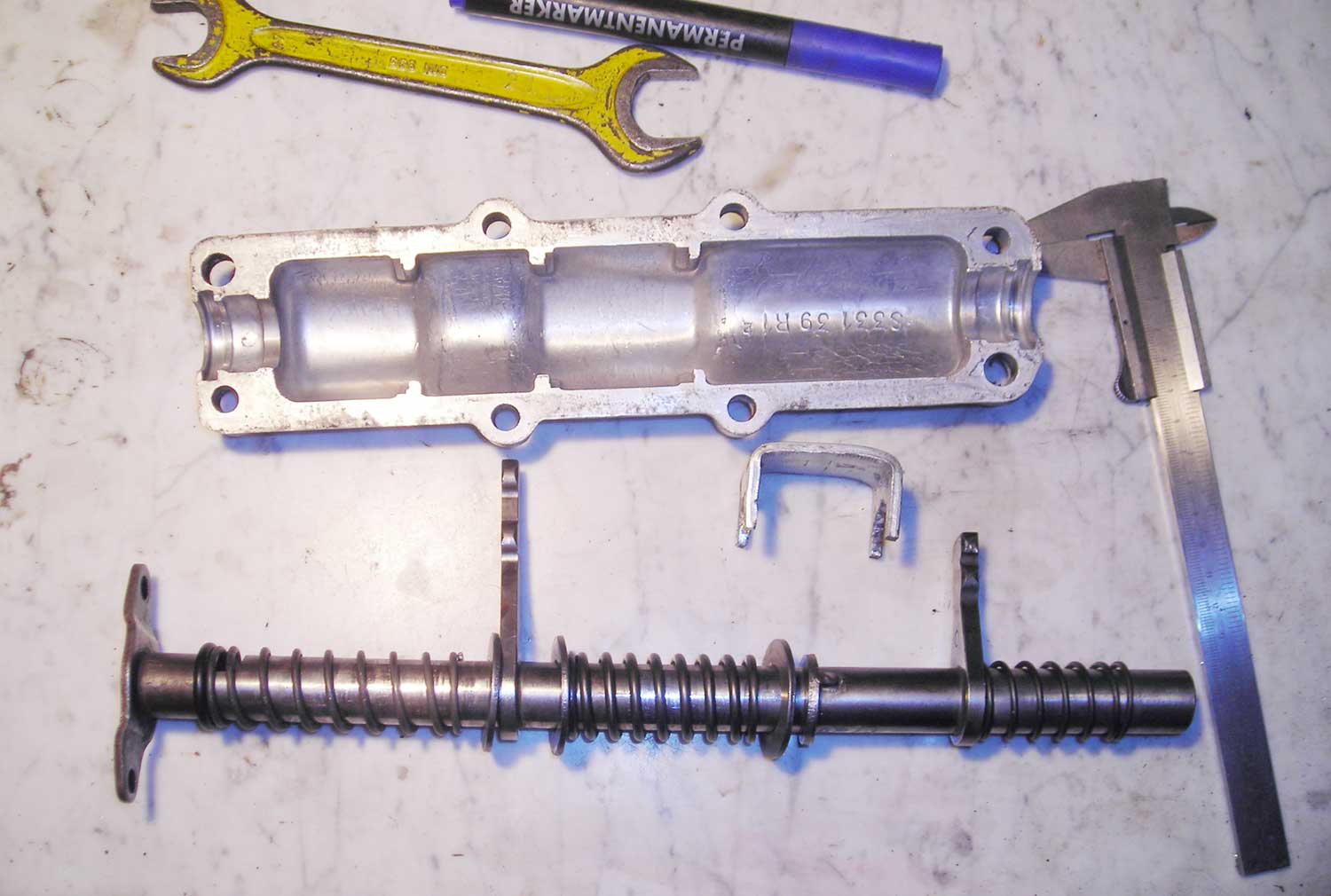 die gereinigten Teile, in der Mitte eine einfache Klammer, um die mittlere Feder gespannt zu halten, der kleine 21er Gabelschlüssel zum spannen der rechten Feder