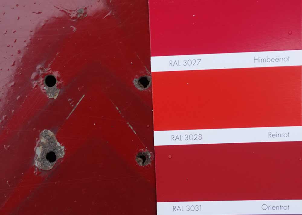 von beiden Rottönen habe ich jeweils eine Heckklappe. Ich habe mal versucht, die Farben im Vergleich zu einem RAL-Farbenfächer zu fotografieren, heute gegen 15:00 bei trübem Wetter ohne künstlichem Licht:
